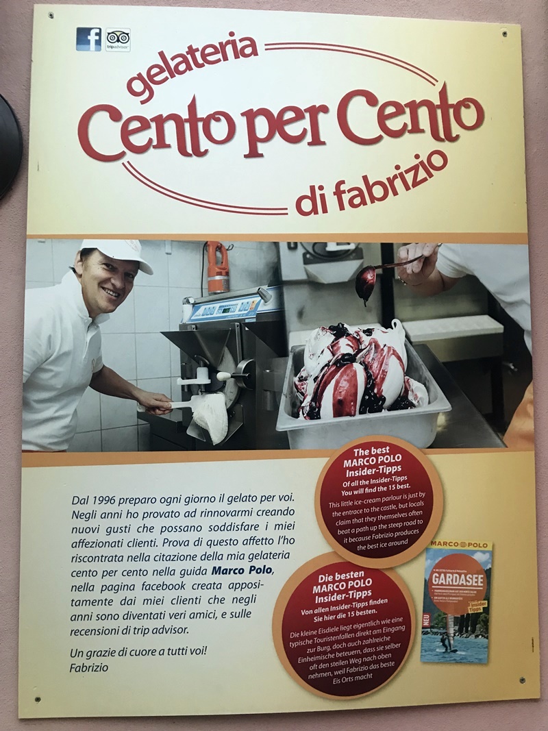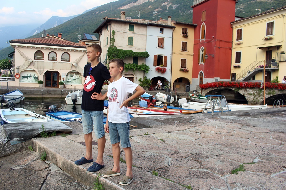 Malcesine – tu pojechaliśmy lokalnym transportem w jedno popołudnie (autobusy jeżdżą dość często). Na miejscu można zwiedzić zamek Castello Scaligero di Malcesine, albo wyjechać kolejką linową na masyw Monte Baldo, skąd podobno rozciągają się przecudne widoki na okolicę. My nie mieliśmy aż tyle czasu, bo potrzebny jest na to ponoć przynajmniej jeden dzień, szczególnie że kolejki do biletów potrafią być spore. Ale sam spacer po uroczych uliczkach Malcesine i przepyszne lody w lodziarni Cento per Cento u Fabrizio (tu: klik) i tak zrobiły robotę. Koniecznie warto odwiedzić również tutejszy port (dokładna lokalizacja tu: klik).