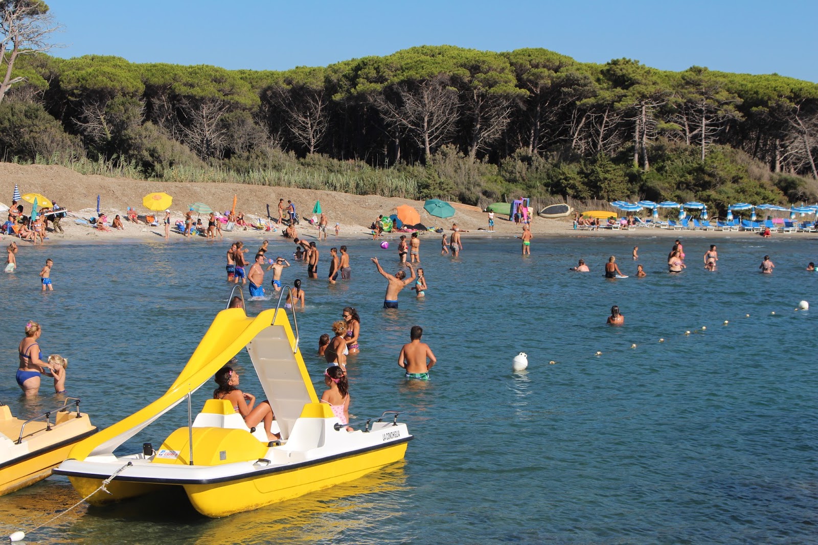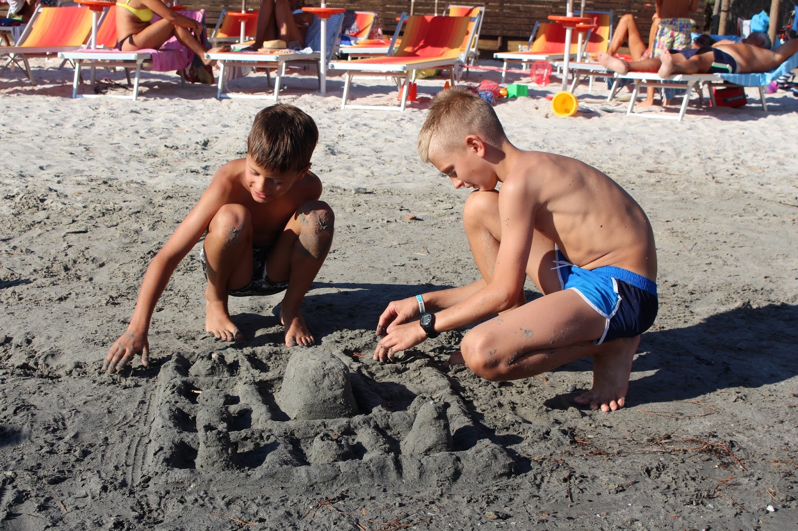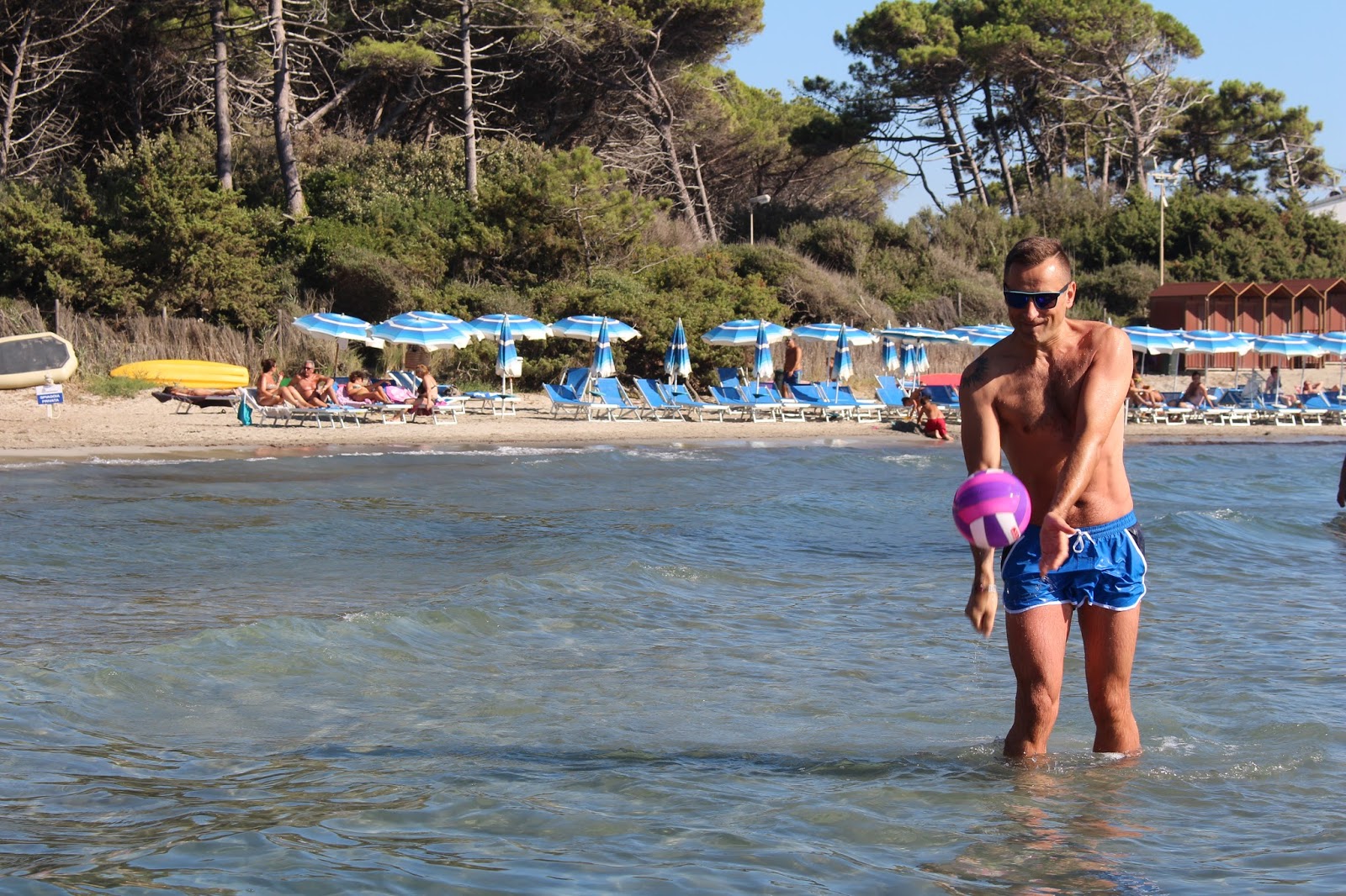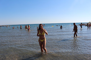 Plaża, nieopodal restauracji ‘La Conchiglia’, ma miluteńki, biały piaseczek i fajny, wolno opadający brzeg – przez co dzieciaki mogły bezpiecznie pluskać się w płytszej wodzie. Można było wypożyczyć również rowerki wodne, wyposażone w zjeżdżalnie (nam niestety nie udało się ich wypróbować – trochę za mocno wiało by wypłynąć na głębszą wodę).Chłopcy natomiast woleli urzędować na basenie, gdzie mogli ciągle nurkować i nie wkurzać się na mega słoną wodę, drażniącą w twarz i wszelkie nawet maleńkie rany na skórze.